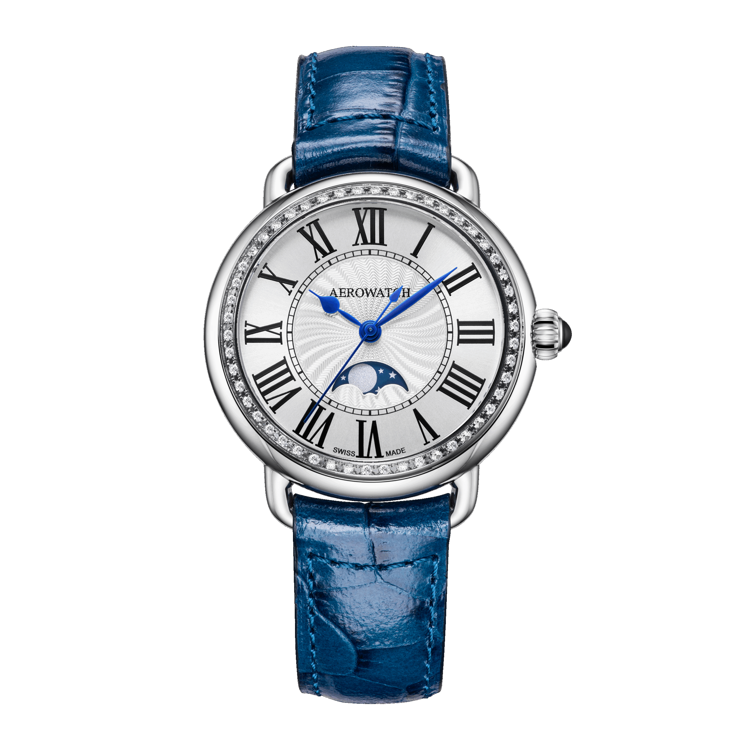 Cette magnifique aérowatch offre un guillochage raffiné avec une phase de lune et une lunette en diamants.