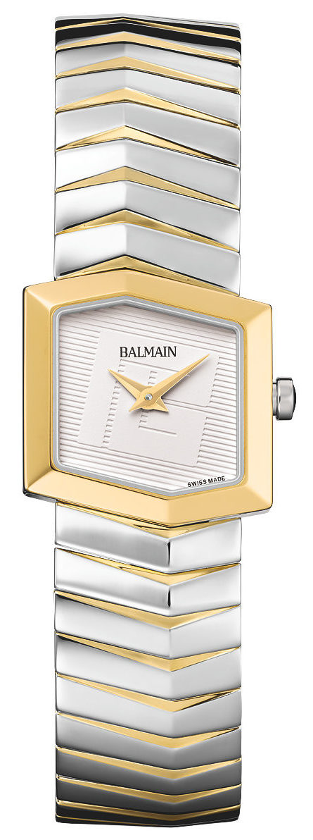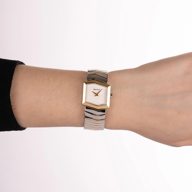 La Balmain Taffetas est une montre pour femme inspirée de la joaillerie, qui allie élégance asymétrique et charme moderne. Son boîtier hexagonal en acier inoxydable bicolor et son bracelet assorti évoquent la beauté nette du taffetas, tandis que le cadran blanc, discrètement signé du logo Balmain, apporte une touche raffinée. D’un diamètre de 22,50 mm, cette montre Swiss Made est dotée d’un verre saphir.