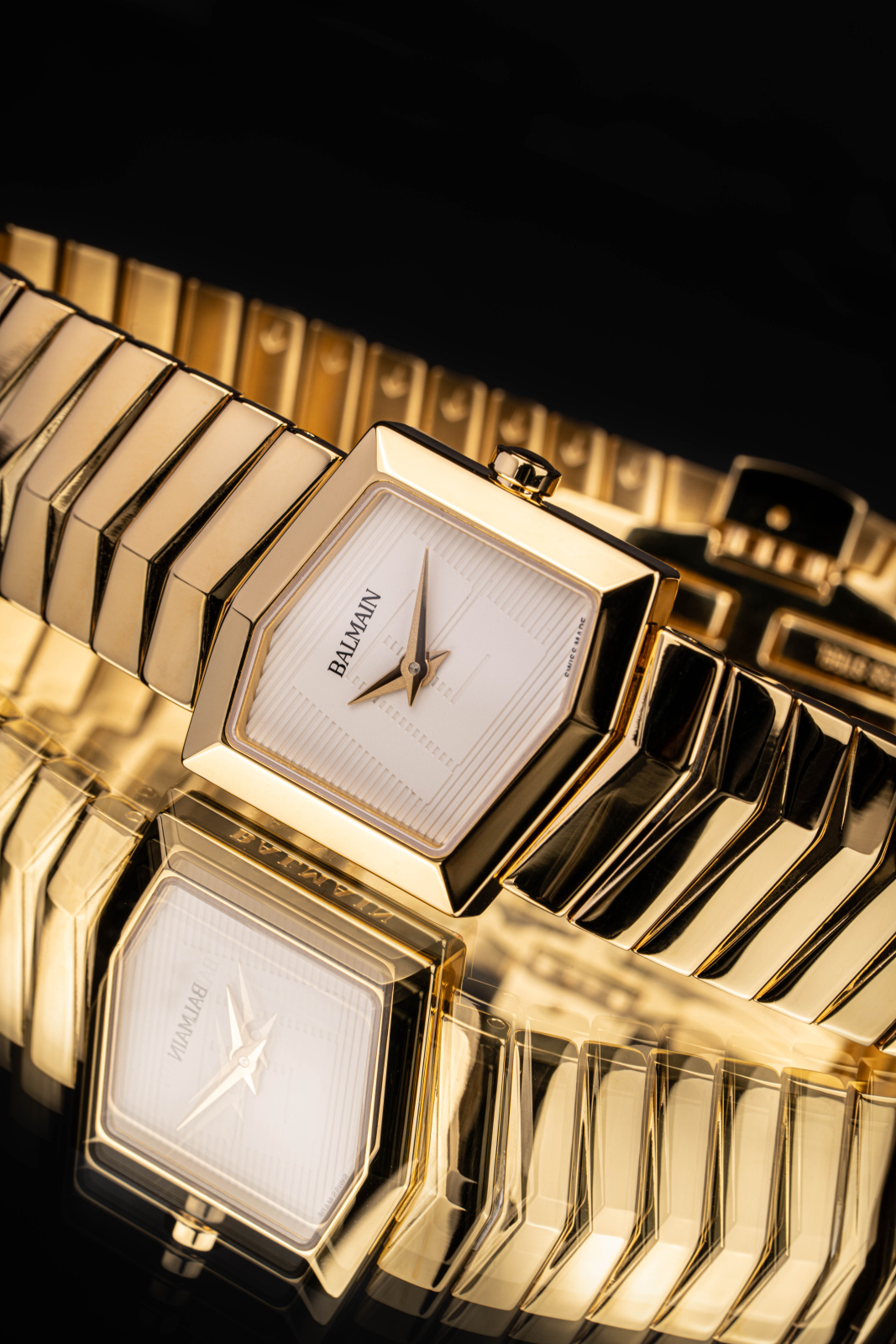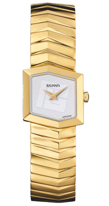 La Balmain Taffetas est une montre pour femme inspirée de la joaillerie, qui allie élégance asymétrique et charme moderne. Son boîtier hexagonal entièrement revêtu de PVD or jaune, assorti à son bracelet, évoque la beauté nette de la soie, tandis que le cadran blanc, discrètement signé du logo Balmain, ajoute une touche raffinée. D’un diamètre de 22,50 mm, cette montre Swiss Made est dotée d’un verre saphir.