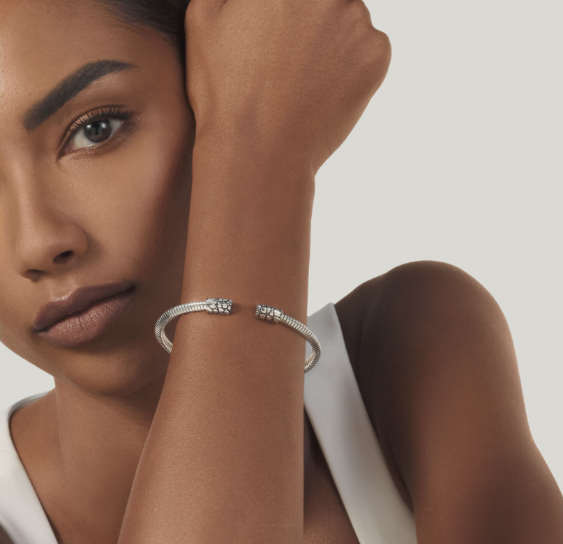 Un bracelet iconique en argent avec maille tubogas triangulaire. Cette version présente une forme classique, avec une ouverture centrale qui épouse le poignet avec élégance. Les extrémités sont finies par des capuchons texture croco, eux aussi de section triangulaire, qui épousent harmonieusement la maille du bijou. Entièrement fait main en Italie.