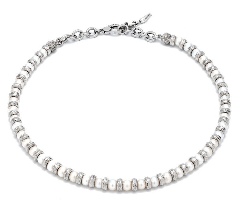 Une luminosité grande, quasi matérielle. Les perles du bracelet Emma, de tous temps reines de la joaillerie, dialoguent en rythme avec des éléments délicats en argent. Un bijou imposant, malgré son décor minimaliste. Giovanni Raspini utilise les perles d’eau douce pour obtenir un résultat résolument contemporain. Fait entièrement à la main en Italie.