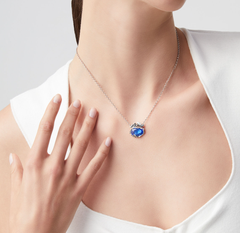 Élégant et raffiné, ce pendentif associe une lunette décorée d’un papillon en argent, réalisé à la cire perdue, à un quartz lumineux de couleur bleu saphir. Le bijou, entièrement fait à la main, est serti sur une chaîne mini-mailles jaseron diamantée.